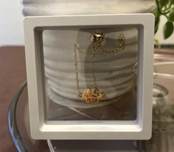 Nos bijoux personnalisables avec les pattes et le nom de votre compagnon à quatre pattes sont un moyen unique d'exprimer votre amour pour votre animal de compagnie. Que vous ayez un adorable chien ou un magnifique chat, ce bijou personnalisé vous rappellera au quotidien votre animal, que vous l'ayez malheureusement perdu ou qu'il soit encore à vos côtés.